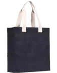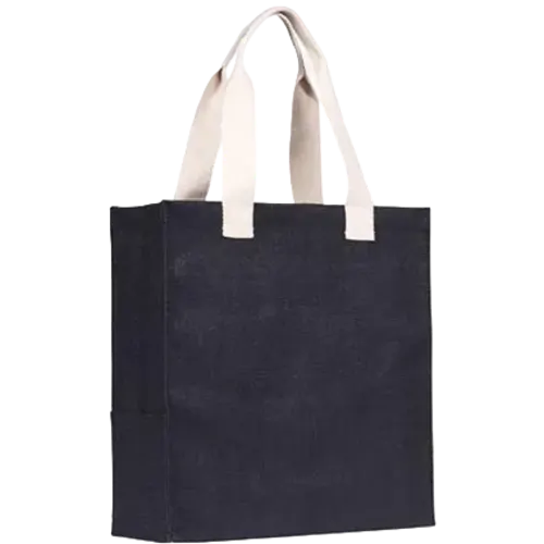 Stylish large tote shopping bag made from 14x15 natural jute in multiple colours, with a PVA starch backing for additional strength. Each bag features a convenient side pocket with comfortable natural cotton webbing handles.