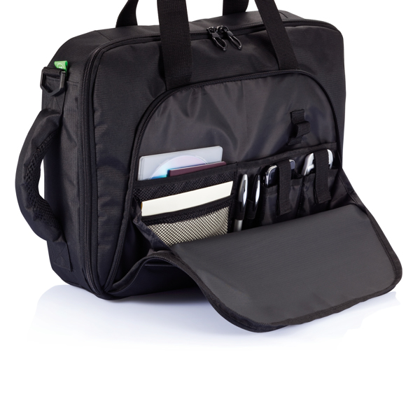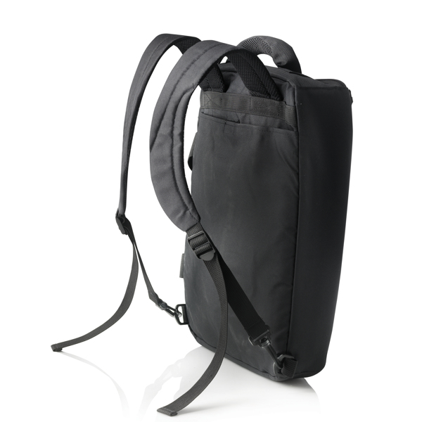 600D ripstop, main compartment with 15,6” laptop pocket, zippered front pocket with organisers inside, back straps can be hidden in back slip pocket, webbing handles on top. PVC free.