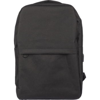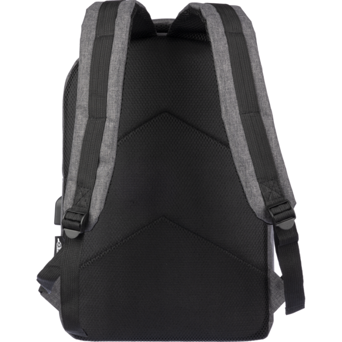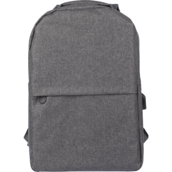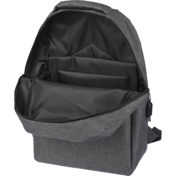Made from 600D recycled PET with over 60% eco-content, it features a USB port with internal cable for on-the-go device charging, a large top zipped compartment, and a front zipped pocket for easy access.