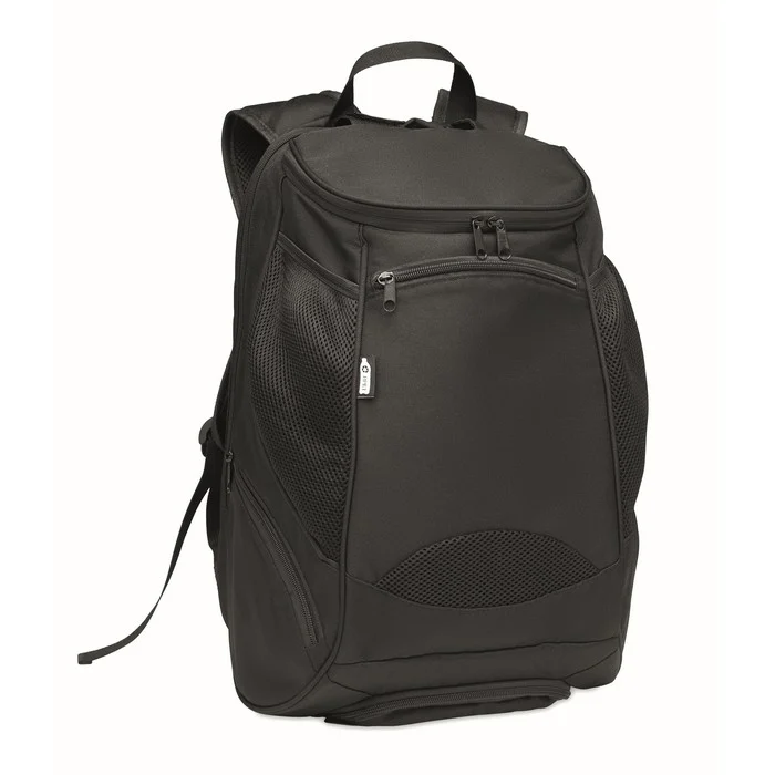 Backpack with the front in high reflective polyester with zippered outside pocket and for comfort a padded back section in 600D polyester.