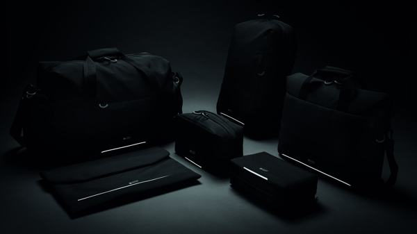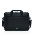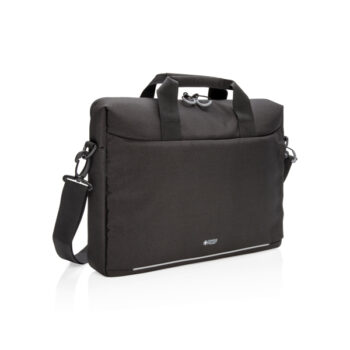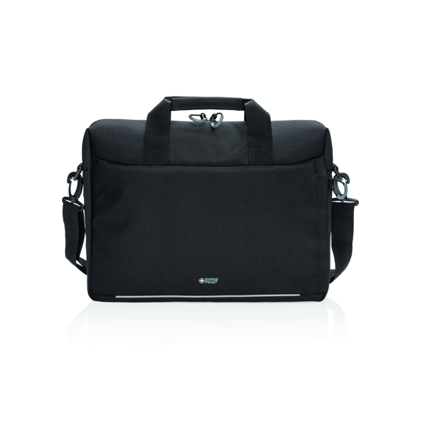 It includes a padded shoulder strap, large rear zippered pockets for accessories like a mouse, phone or pens, a front zip pocket for extra gear, a trolley sleeve, and RFID protection. The reflective front safety strip adds an extra touch of security.